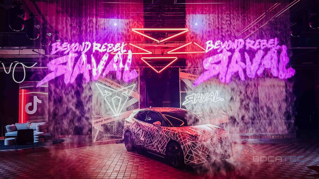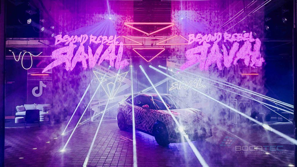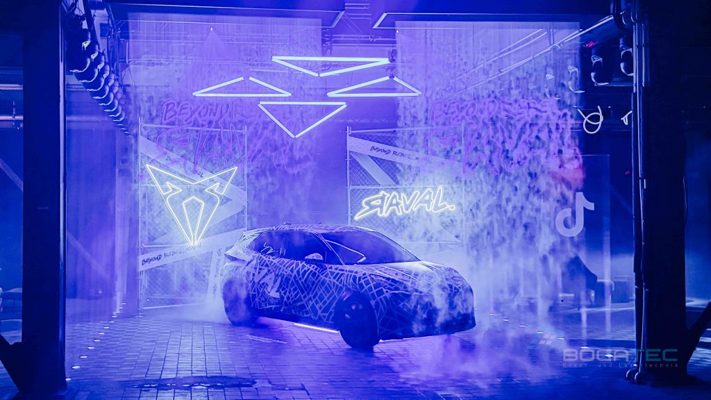 Ein zentrales Element der Autopräsentation waren die eingesetzten Fogwalls. Fogwalls sind kontrollierte, vertikale Nebelwände, die gezielt als semi-transparente Projektions- und Lichtflächen genutzt werden. Sie ermöglichen es, Licht, Beams und grafische Inhalte scheinbar frei im Raum schweben zu lassen, ohne feste Screens oder bauliche Elemente zu benötigen. In der Inszenierung des CUPRA Raval dienten die Fogwalls dazu, den Raum visuell zu strukturieren, Tiefe zu erzeugen und das Fahrzeug atmosphärisch einzurahmen. Logos, Schriftzüge und Lichtstrukturen erschienen direkt in der Nebelwand und verstärkten so die Wirkung der Autopräsentation, ohne den Blick auf das Fahrzeug zu blockieren. Durch ihre flexible und elegante Wirkung sind Fogwalls ein ideales Werkzeug für moderne, immersive Autopräsentationen mit hohem ästhetischem Anspruch.