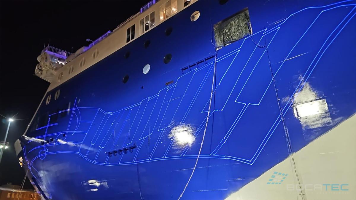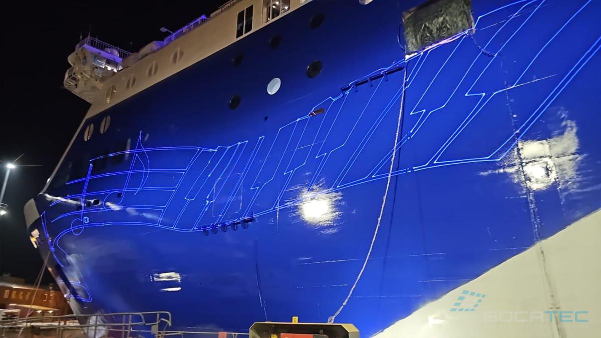 Mit Bocatec bekommen Sie keine theoretische Technikidee, sondern einen praxistauglichen Prozess für die Werft: Wir denken in Setup, Sichtbarkeit, Abläufen und Übergaben an das Lackierteam. Das Ziel ist, dass die Laserprojektion vor Ort nicht „beeindruckend aussieht“, sondern echte Arbeit spart. Die Großflächenprojektion macht aus einer komplexen Großflächenlackierung einen klar strukturierten Ablauf: Kontur projizieren, sauber nachziehen, abkleben, ausmalen – fertig.