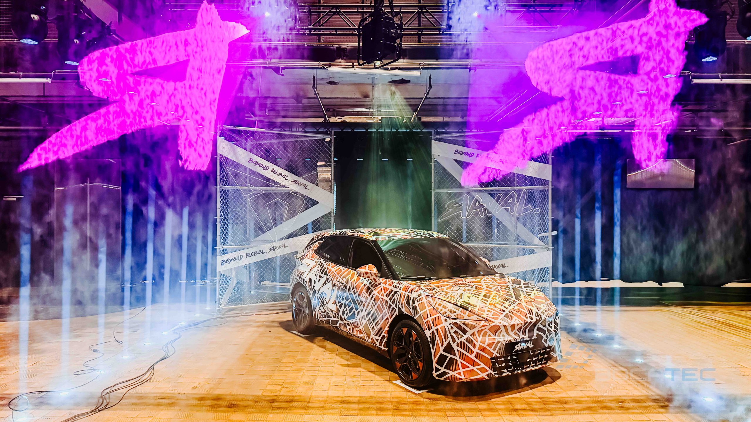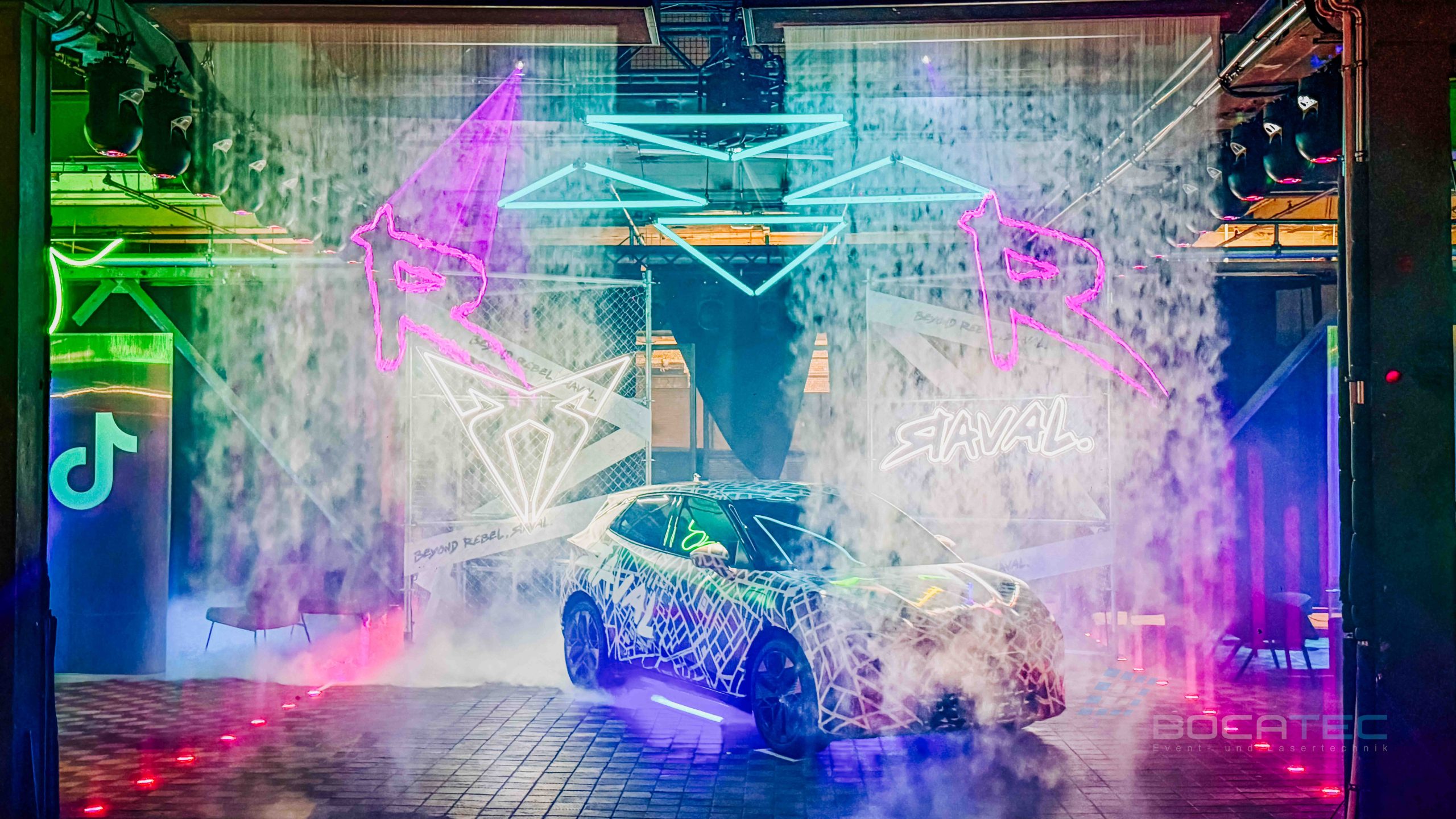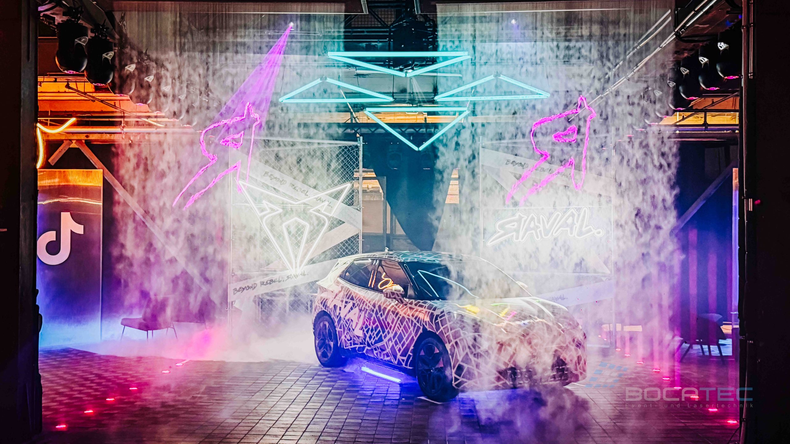 Ein zentrales Element der Autopräsentation waren die eingesetzten Fogwalls. Fogwalls sind kontrollierte, vertikale Nebelwände, die gezielt als semi-transparente Projektions- und Lichtflächen genutzt werden. Sie ermöglichen es, Licht, Beams und grafische Inhalte scheinbar frei im Raum schweben zu lassen, ohne feste Screens oder bauliche Elemente zu benötigen. In der Inszenierung des CUPRA Raval dienten die Fogwalls dazu, den Raum visuell zu strukturieren, Tiefe zu erzeugen und das Fahrzeug atmosphärisch einzurahmen. Logos, Schriftzüge und Lichtstrukturen erschienen direkt in der Nebelwand und verstärkten so die Wirkung der Autopräsentation, ohne den Blick auf das Fahrzeug zu blockieren. Durch ihre flexible und elegante Wirkung sind Fogwalls ein ideales Werkzeug für moderne, immersive Autopräsentationen mit hohem ästhetischem Anspruch.